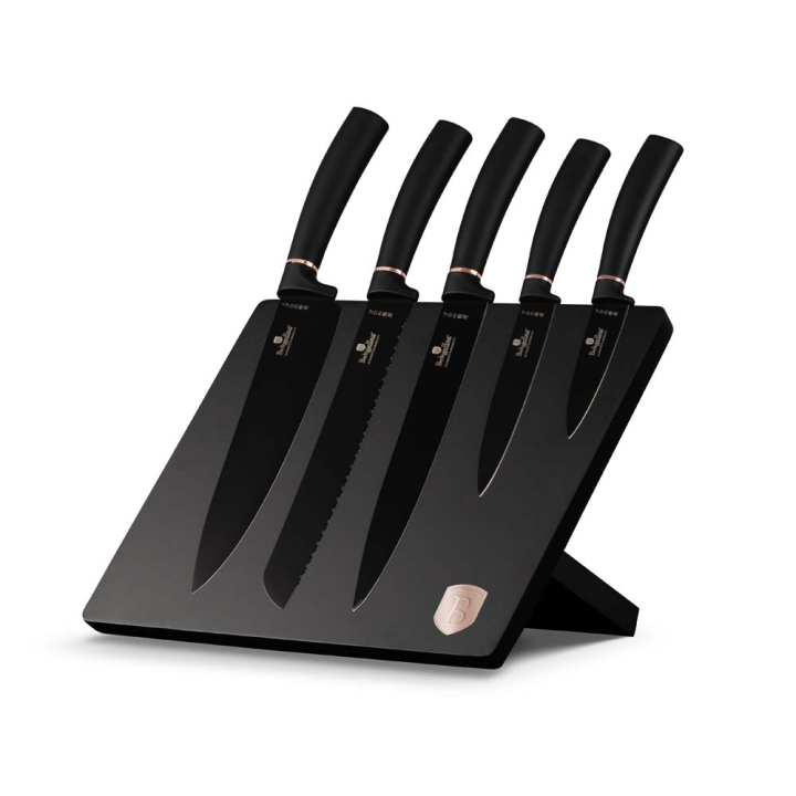 Комплектът е изработен от първокласна неръждаема стомана с елегантни детайли в цвят розово злато. Модерната визия впечатлява от пръв поглед и носи революционен заряд във всеки кулинарен кът. Ножовете предлагат функционалност, удобство и категорична безопасност по време на работа.
