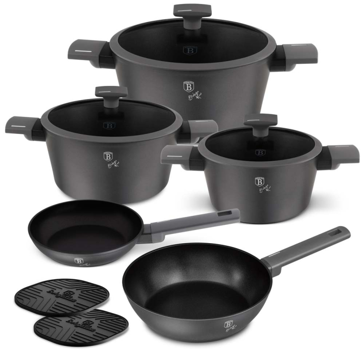 Комплектът предлага елегантност и практичност в кухнята. Съдовете са изработени от кован алуминий, който осигурява равномерно разпределение на температурата при готвене. Незалепващото покритие TitanPro улеснява приготвянето на храна и почистването след това.