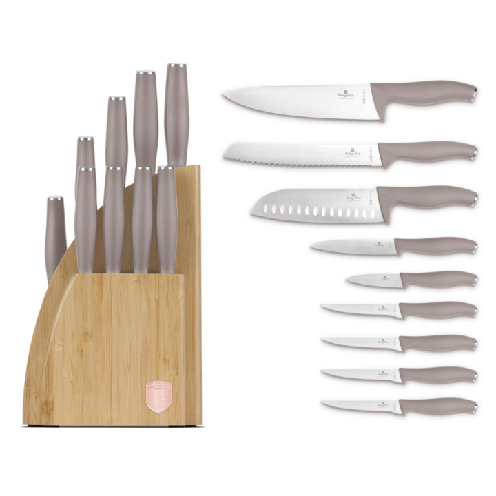 Комплектът е елегантен и фукнционален. С изискано матово покритие и бамбукова стойка, той подобрява кулинарното преживяване. Независимо дали приготвяте гурме ястия или се справяте с ежедневните задачи в кухнята, този комплект ножове ще бъде вашият предпочитан кулинарен набор от инструменти. Ергономичните дръжки осигуряват сигурно и удобнозахващане и намаляват умората в ръцете при продължителна употреба.