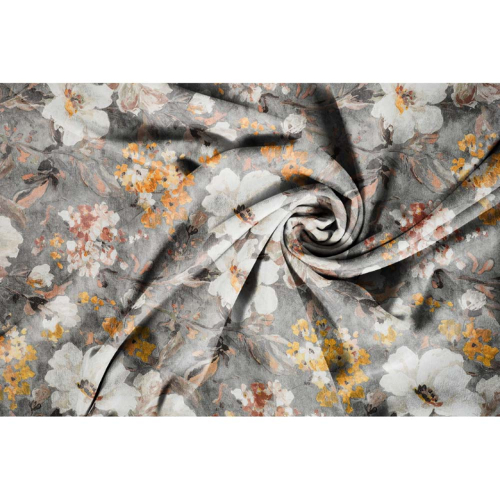 Плътен плат с флорални мотиви в бяло, сиво и жълто, ширина 280 см.