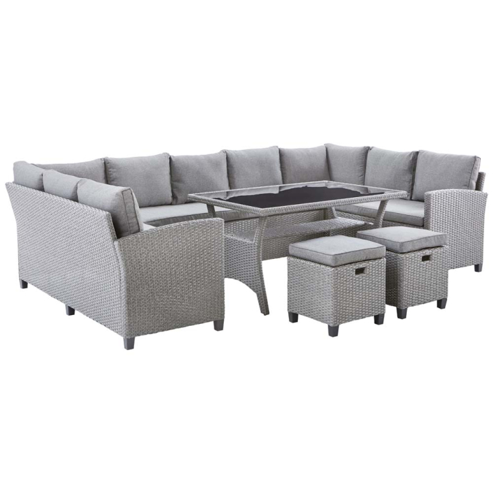 Тройката диванчета имат функция да се съединяват в ъглова композиция, която придобива визия на елегантно разположен насред градината диван. Размерите им 2 х Ш/Д/В 67/165/73 см и 1 х Ш/Д/В 67/160/73 см позволяват събиране на весела група приятели сред природата навън и обещават издръжливост до 360 кг. Кокетните табуретки (Ш/Д/В 40/40/39 см) са винаги на разположение, за да създадат комфорт при сядане или отпускане на краката, когато се използват единично пред дивана. Те също са с похвална поносимост към тежест – до 120 кг. Разковничето, разбира се, са меките възглавници, разпределени по седалки и облегалки - удобни, отпускащи и много лесни за поддръжка, в синхрон с цвета на градинския комплект.