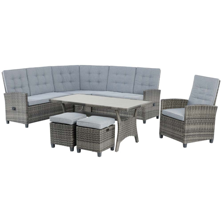 Големият ъглов диван, фотьойлът за домакина, двете кокетни табуретки и масата с допълнителен плот, дават пълна гаранция, че повече от това не е необходимо за едно празнуване на лятото. Елегантният сет е в универсален, вечен сив цвят, с включени пухкави възглавници за сядане и облягане, които допълват общия цветови стил. Модулният дизайн на дивана се състои от две пейки, съединяващи се с ъгъл.