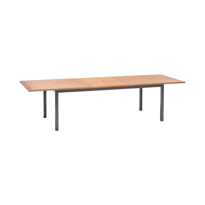 Рамката от висококачествен алуминий, неподатлив на атмосферни влияния и изключително лек, осигурява спокойно и дълготрайно ползване. Плотът е в хармония с любимите мигове на открито, със своя топъл естествен цвят на дървото.