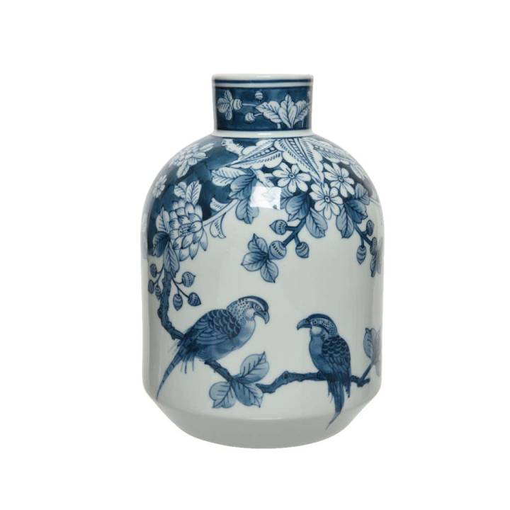 Чаровната ваза с нежна орнаментика ще ви спечели с хармонията, създаваща около себе си. Фината флорална декорация в син цвят върху бял фон и двете птички, кацнали едно срещу друго, привличат вниманието. Поставете я върху мебелна повърхност или ниско на пода, за да се насладите на промяната в интериорното пространство. Използвайте я за съхранение на свежи цветя или за декорация с изкуствени, за да допълните стила с красив аксесоар.