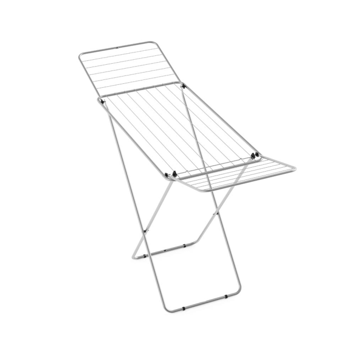 Сушилникът е компактно сгъваем и много удобен за разполагане на текстил с разнообразен размер и дължина. Здравите метални тръби са изцяло боядисани с електростатична неръждаема боя. Осигурени са практични пластмасови накрайници за стабилност и предпазване на пода от нараняване, включително механизъм за защита от неволно сгъване.
