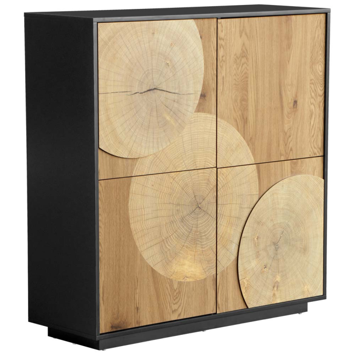 Комодът Ууди е съвършен баланс между натурална естетика и съвременен минимализъм. Светлият дъбов декор, комбиниран с черна рамка, създава усещане за уют и стил, докато уникалният дизайн с имитация на годишни кръгове от дърво внася природна хармония в интериора. Това е не просто мебел, а впечатляващ завършен елемент на интериора, предлагащ достатъчно място за съхранение.