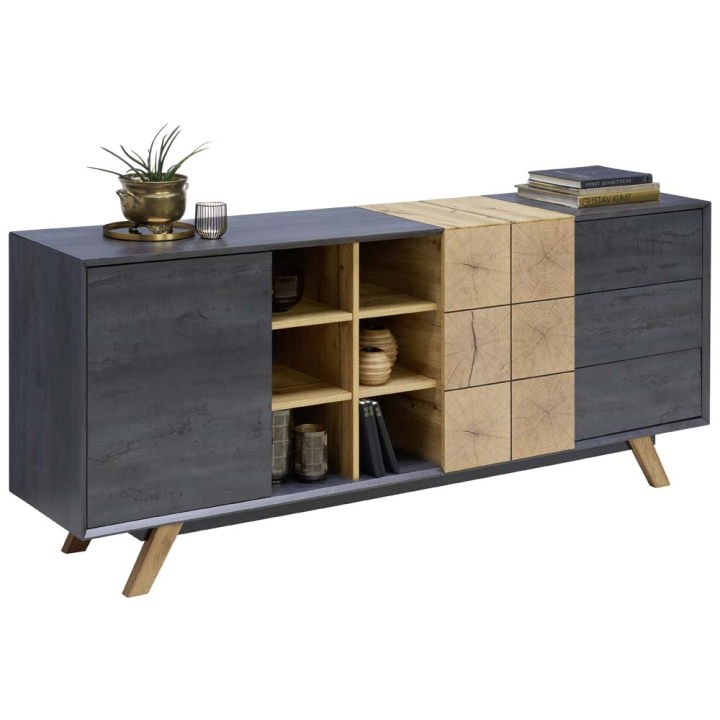 Комод Кик с 2 врати, 3 чекмеджета и 6 отворени ниши в декори дъб и антрацит, размери: 180/40/75 см