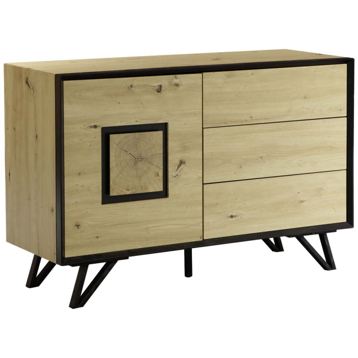 Комодът Нова впечатлява със съчетанието на естествена топлина и модерен индустриален акцент. Светлият дъбов декор носи усещане за уют, докато черните метални крака и рамка добавят стилен контраст и съвременна елегантност. Минималистичната форма и изчистеният силует превръщат този модел в идеален акцент както за дневна, трапезария, така и за спалня или антре.