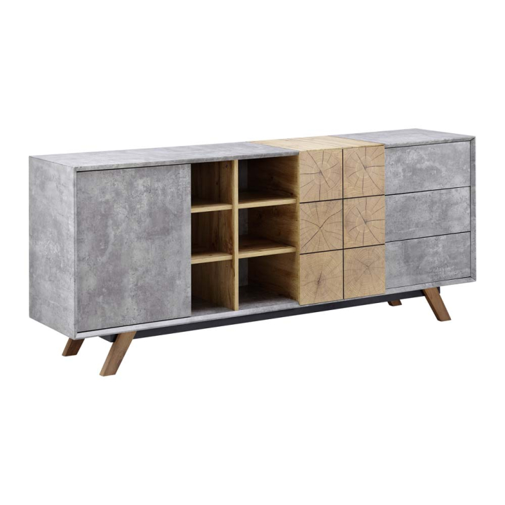 Комод Каспър с 2 врати, 3 чекмеджета и 6 отворени ниши в декори дъб и сив бетон, размери: 180/40/75 см