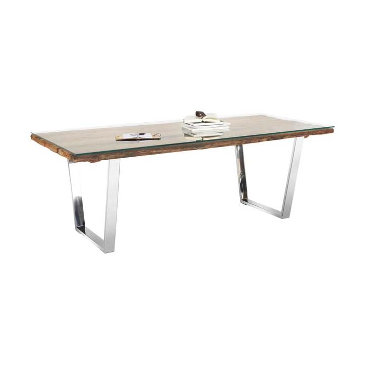 Изключително модерна трапезна маса, с хромирани стоманени крака и плот от масивна дървесина, в комбинация със стъкло. Красивият "жив кант" придава автентичност и подсилва естественото присъствие на дървото. Контрастът с правоъгълния метален крак и стъклото, с лек полъх на урбанистичен стил, превръща тази мебел в умела симбиоза между различните стилове. Освен с балансирания си дизайн, тя пленява и със своята функционалност. Има подчертан характер и добра предпоставка да се превърне в сърцето на всяка дневна, добавяйки едно по-високо ниво на дизайна.