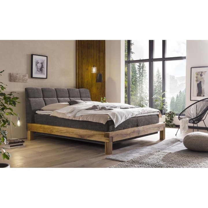 Луксозно боксспринг легло с тапицирана табла с размери на модела Ш:199/Д:231/В:112 см. Артикулът е проектиран за матрак с размери 180/200 см достатъчно голям за здравословен и комфортен сън на двама човека. Леглото е оборудвано с два матрака, поставени един до друг с най-висока степен на твърдост (H2-H2) с размери 90/200 см. Обърнете внимание, че матраците могат да бъдат с различна степен на твърдост, според индивидуалните предпочитания на всеки партньор. Седем зоналните матраци позволява на тялото да заеме най-удобна позиция по време на сън и по този начин осигуряват максимален комфорт. Върху двата матрака, за повече удобство е поставен топ матрака с гел пяна с височина 5 см. Двойното легло притежава атрактивна дизайнерската табла, тапицирана с висококачествен текстил на правоъгълници с пълнеж от пяна. Конструкцията на леглото е произведена от масивни греди, импрегнирани с био масло с натурална дървесна текстура, като силно впечатлени ще ви направи автентичната гредова сглобка на рамката. Комбинацията между красив дизайн, текстил и масивна дървесина създават уникален домашен уют, красота и атмосфера на висок стандарт и класа. Леглото създава цялостно уникално впечатление, а завидния комфорт и удобство, които предлага ще остане за дълго във вашето съзнание. Препоръчваме ви към леглото да поръчате нощни шкафчета със същата дизайнерска линия, които се монтират върху страниците на леглото.