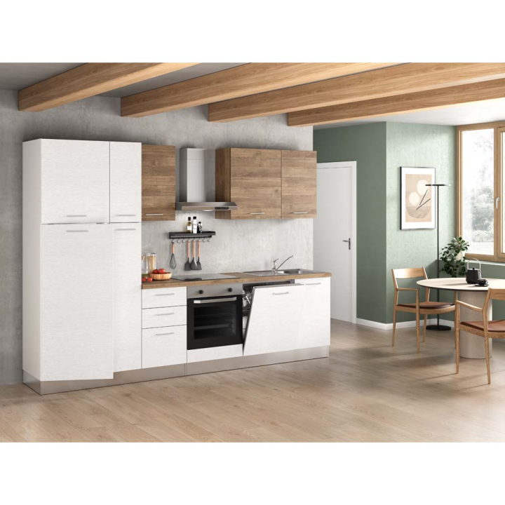 Кухнята впечатлява с комбинация от декори в сив дъб и бял мат, създавайки топла и изискана атмосфера. Оборудвана с термоустойчив плот, шкаф килер за организиране на продукти и хладилен шкаф, които могат да се конфигурират отляво или отдясно, според вашите предпочитания. Всички модули са сглобени и окомплектовани с вградени електроуреди, мивка и смесител, което я прави готова за употреба.