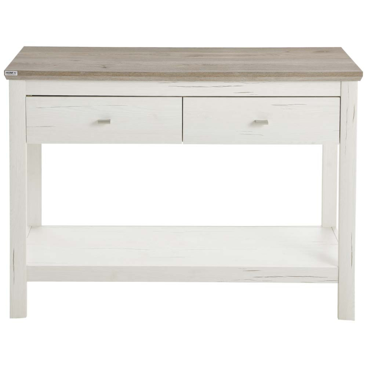 Конзолна маса с две чекмеджета с размери Ш:120/Д:43.6/В:85 см. Прекрасно би стояла, както в спалнята, така и в антрето. Притежава елегантна конструкция с две чекмеджета в светло сив цвят, както и плот с размери 130/43,6 см, в светъл дървесен декор. Чекмеджетата са ефикасен помощник за съхранението на дреболийки и принадлежности в дома, които винаги лесно ще намирате. Големият рафт в основата на маса е другото удобно място за поставянето на вещи.
