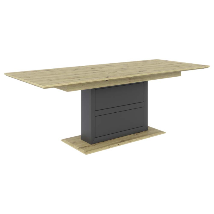 Модерна разтегателна трапезна маса с размери Ш:180-220/Д:90/В:76.5 см. Моделът притежава модерен и атрактивен дизайн, като със сигурност ще привлича вниманието в помещението със своя стил и визия. Плотът е произведен от MDF в светъл дървесен декор (дъб Артисан), поставен на правоъгълна конструкция декорирана със сив цвят. Плотът на масата може да бъде разширен с 40 см посредством синхронен механизъм за удобното и комфортно хранене от 6 до 8 човека.