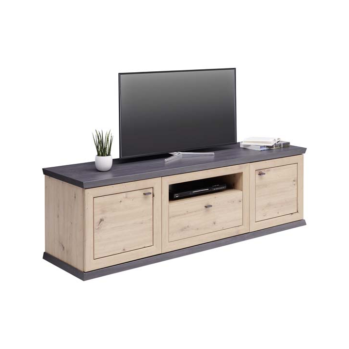ТВ шкаф с чекмедже в рустикален стил с размери Ш:180/Д:50/В:56 см. Шкафът ще ви впечатли със своята визия и функционалност. Разполага с обширен плот, две отделения с врати на панти с плавно затваряне, отворена ниша, както и чекмедже. Произведен е от ПДЧ и MDF с атрактивна дъбова текстура с чворове в светъл натурален декор. Фронтовете на вратите са специално моделирани на правоъгълници посредством улеи. Основата и горният плот на шкафа са в черен декор, стилно откроени от конструкцията и вратите. Може да бъде поставен в помещения в най-различни стилове, но прекрасно би стоял в стая с интериор в рустикален, занаятчийски или индустриален стил.