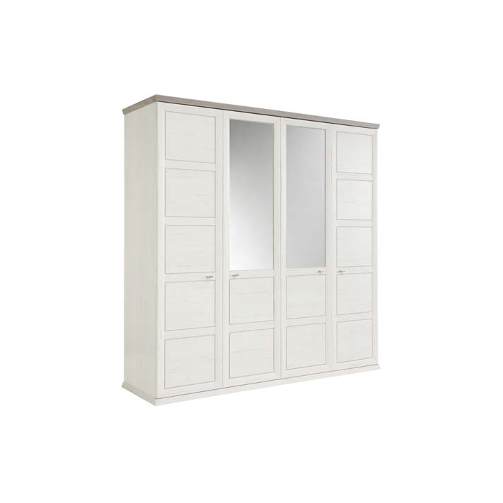 Гардероб с четири врати на панти, две от които огледални с размери на модела Ш:204.2/Д:60/В:209 см. Със своите размери и вътрешно разпределение, гардеробът е удачно решение за обзавеждане за спалнята на двойка споделяща общо пространство. Притежава две практични отделения, в които дрехите с различно предназначение и стил ще намерят своето място. Артикулът е със класическо вътрешно оборудване с монтиран по един лост за закачалки и един рафт. На лостовете за дрехи бързо ще намерят място костюмите, ризите, саката и други връхни дрехи, които държим на закачалки, а на рафтовете удобно може да поставим одеяла, завивки, спално бельо и други домашни вещи. В пространството под лоста за закачалки има достатъчно място за предмети, които искате деликатно да скриете в гардероба в кутии за съхранение на предмети или кутии за обувки. Продуктът е произведен от висококачествено ПДЧ в бял цвят и светъл дървесен декор, елегантно открояващ различните елемент на гардероба.