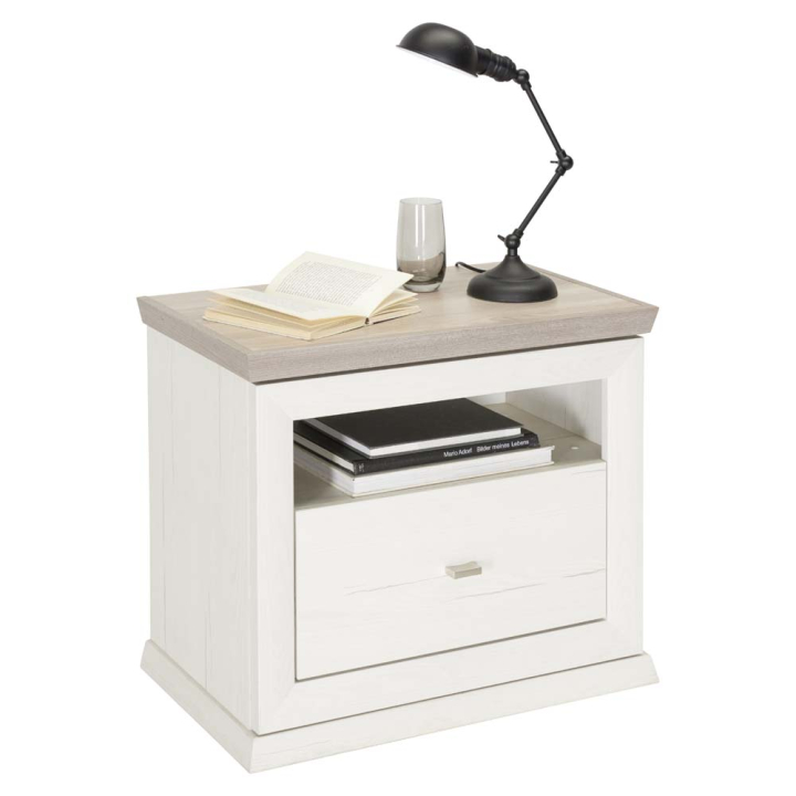 Нощно шкафче с размери Ш:62.8/Д:38/В:55 см. Притежава компактен плот с вътрешен кант в светъл дървесен декор, върху който нощната лампа и увлекателната книга ще намерят своето удобно място. Под плота е обособена 1 отворена ниша, както и 1 практично чекмедже със сребриста метална дръжка. Отличава се с плот с вътрешен кант, сребриста дръжка, както и основа с арт цокъл с височина от 4 см.