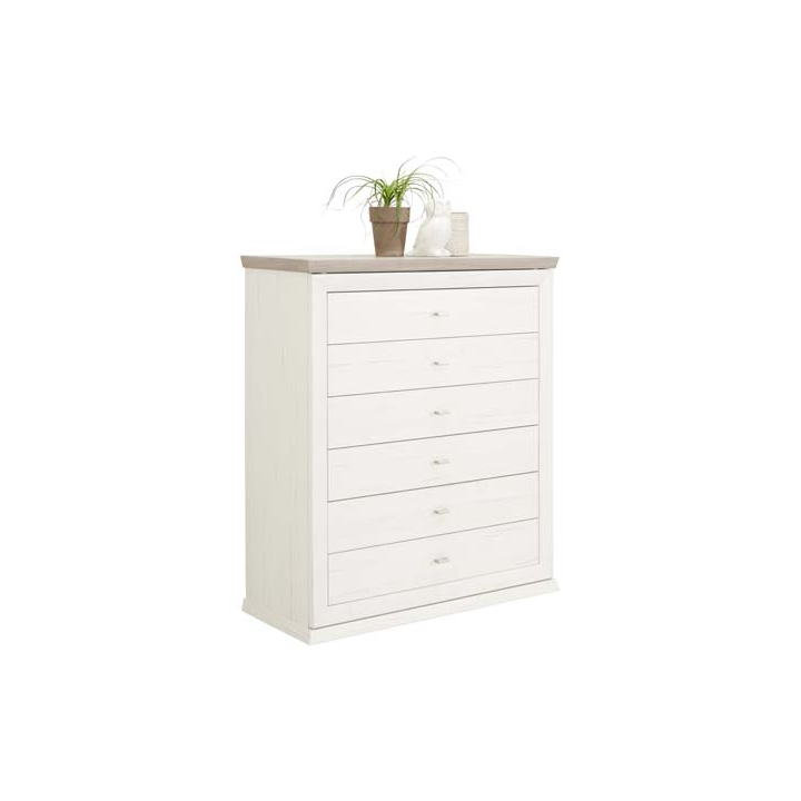 Елегантен и практичен комод с чекмеджета с размер Ш:95.1/Д:42.8/В:115 см. Притежава компактен плот с вътрешен кант в светъл дървесен декор, върху който ваза с цвете или красива статуетка ще стоят страхотно. Под плота са монтирани 6 чекмеджета с плавно затваряне със сребристи метални дръжки, които предоставят много място удобното съхранение на дрехи, одеяла, завивки лични вещи и др. Отличава се с плот с вътрешен кант, чекмеджета с фронтове моделирани на правоъгълници, както и основа с арт цокъл с височина от 4 см.