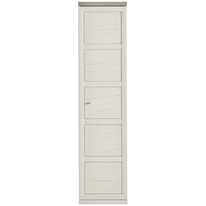 Офис шкаф с размери Ш:50.6/Д:43/В:209.2 см. Притежава красив дизайн и визия, стилно моделиран в бяла и сива дървесна текстура (бор). Стилно издадения горен плот в сива дъсчена текстура и конструкция репродукция на бял бор с откроени дървесни пукнатини, без усилие ще добави рустикален уют към помещението, дизайн достоен и за най-луксозните офиси с винтидж интериор. Зад вратата на панти с декоративни улеи, са монтирани 4-ри рафта за функционалното съхранение на класьори, папки, офис документация и други предмети. Шкафът притежава горен плот в сив дървесен декор и красив цокъл в бяло с височина 4 см. Практично може да комбинирате шкафа с останалите мебели от серия Камрон, за да създадете интериор с единна дизайнерска визия с много място за съхранение на предмети.