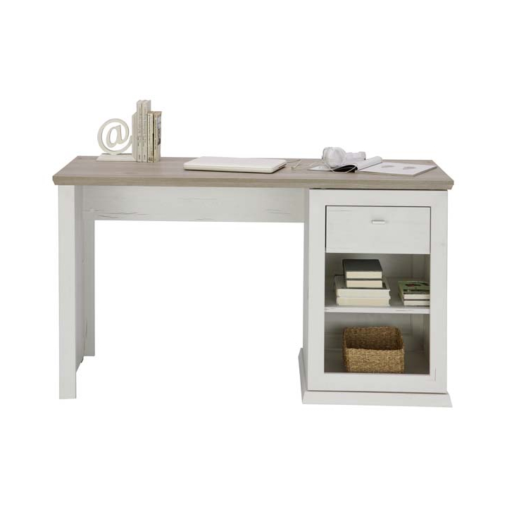 Притежава красив дизайн и визия, стилно моделиран в бяла и сива дървесна текстура (репродукция на бор). Умело може да комбинирате модела с останалите мебели от серията, за да създадете помещение в единна дизайнерска визия с практично място учение или плодотворна работа. Плотът е стилно издаден, а основата е проектирана с красив цокъл с височина 4 см.