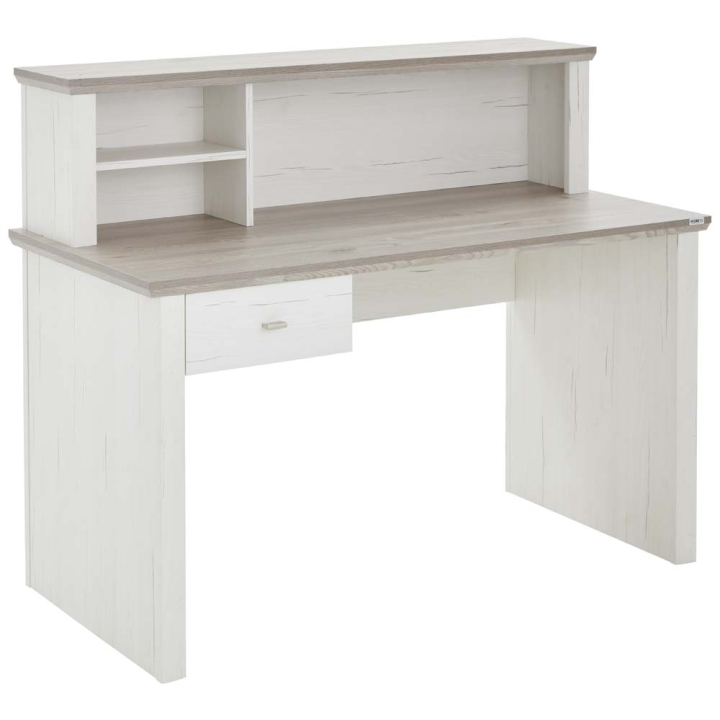 Бюро с надстройка и чекмедже с размери Ш:138/Д:65/В:110 см. Моделът разполага с компактен плот, върху който е монтирана надстройка с 3 отворени ниши, с възможност за монтаж в ляво и дясно на бюрото. Под плота е монтирани 1 чекмедже, за съхранението на дреболийки. Гореният плот на бюрото е в сив дървесен декор и арт цокъл в бяло с височина 4 см. Умело може да комбинирате модела с останалите мебели от серията, за да създадете дневна в единна дизайнерска визия с практично място за съхранение на домашни предмети.