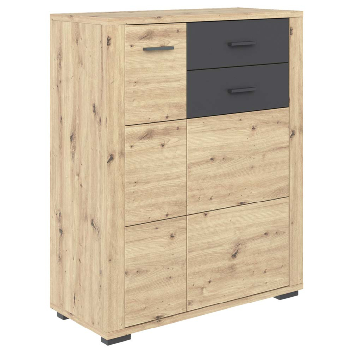 Шкаф за обувки с чекмедже с размери Ш:85/Д:38/В:105 см. Моделът се състои от компактен плот, под който е обособено 1 отделение с 2 врати на панти и 1 чекмедже. Зад варите са монтирани 4 рафта, 3 от които регулируеми с максимален капаците около 16 чифта. Шкафът е произведен от ПДЧ в 2 основни цвята: антрацит и светъл дървесен декор. Дъбовата текстура е с тъмни чворове преобладаваща в цялостната визия, като единствено чекмеджето е в антрацитен цвят.