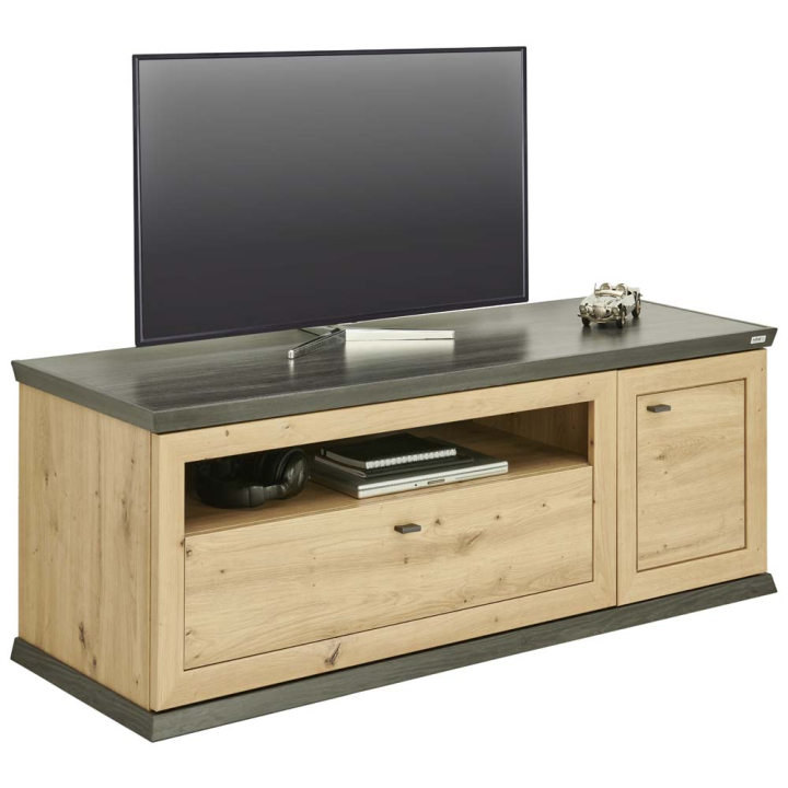 ТВ шкаф изработен в естествени дървени цветове и тъмносив цвят с размери: 150.2/50.3/55.4 см