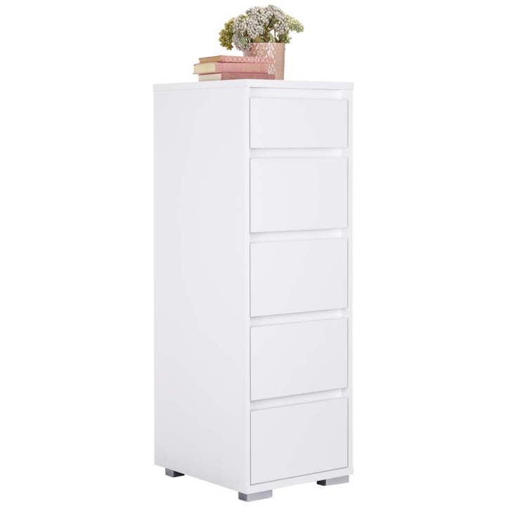 Стилен и функционален комод в декор Бяло, с 5 чекмеджета. Конструкция за отваряне без дръжки. Габаритни р-ри 40/48/120h см
