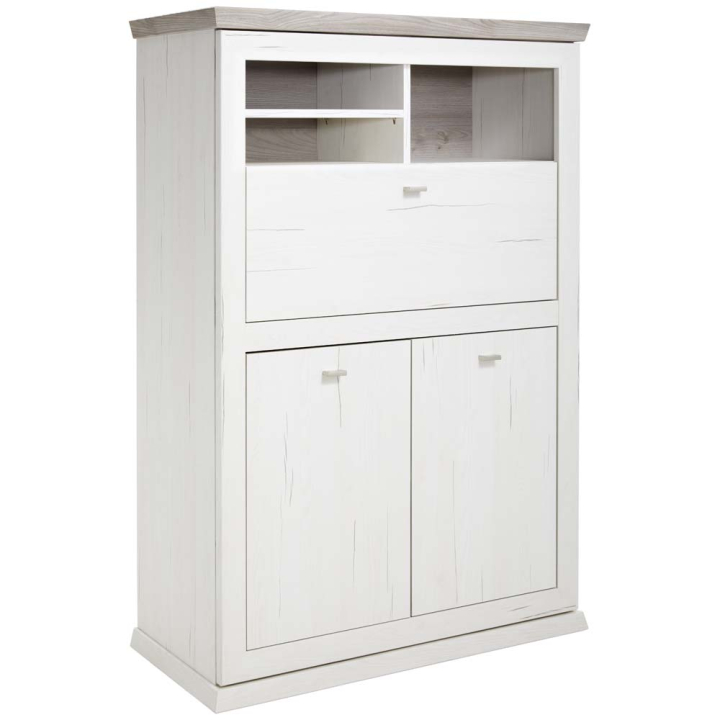 Елегантен и практичен комод с три отделения с размер Ш:90/Д:43/В:134 см. Шкафът е с мултифункционално предназначение и може да се използва и като бюро. В най-горното отделение са обособени три ниши за малки предмети и пособия. Средното отделение е достъпно посредством врата, която се отваря надолу и може да се използва като работен плот за работа с лаптоп. В най-долното отделение, зад вратичките е монтиран един рафт за домашни предмети и вещи. Освен със своята практичност, шкафът ще ви допадне и със своята елегантна визия. За безпроблемна употреба се препоръчва монтаж на шкаф към стената.