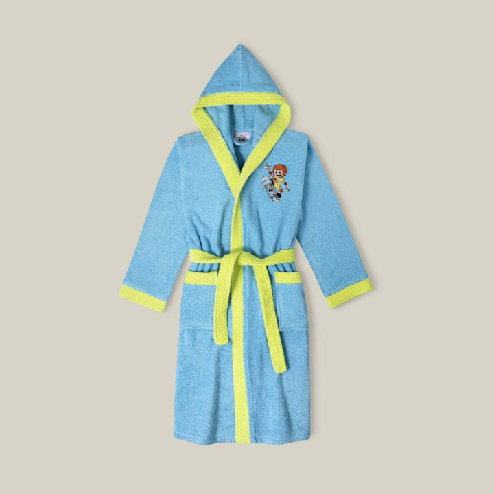 Памучен детски халат за баня с качулка 10-12 г., синьо със зелен кант.