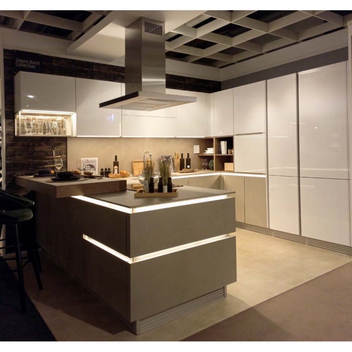Просторна П-образна кухня, произведена в Германия от висококачествени материали и механизми със съвременен дизайн. Мебелите впечатляват със гланцовото си покритие и шкафове без дръжки. Състои се от термоплот, стенен панел, горни, долни и високи кухненски шкафове с включена мивка, смесител и електроуреди. При монтаж изисква повече пространство, но мебелите притежават особен чар, незаменим стил и много място за съхранение. Дизайнът на шкафовете се отличава се с гладка повърхност в два основни декора бял гланц и сив цвят (текстура на бетон) в комбинация с иноксови електроуреди и черен ел. керамичен плот. Кухнята е снабдена с дълбока правоъгълна мивка и висок кухненски смесител с една дръжка за регулиране на температурата на водата. Съвременната визия на мебелите, ефектно е допълнена с декоративно LED осветление, монтирано под горния ред шкафове, както и на долните шкафове под плота. Кухнята разполага с двуместен мини бар с плот в светъл дървесен декор (дъбов фурнир), за приятно изкарване на времето с любим човек или приятел. Оборудване е и с етажерката от естествен фурнир, която освен красива предоставя бърз достъп до предметите поставени на нея. Висококачествените мебели и електроуреди са гаранция, че кухнята ще ви служи вярно дълги години, където храната за цялото семейство ще бъде бързо приготвена и много вкусна.