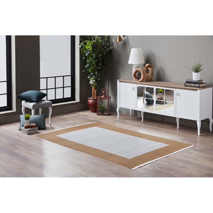 Този килим е атрактивно проектиран с широка рамка по всички краища, образувана чрез златист нюанс на кафявото. В резултат, визията му е нетипична и отличителна, поставяща модерно присъствие във вашия интериор. Универсалният и изчистен от шарки дизайн е подходящ за всеки тип обзавеждане, предлагайки семпла елегантност.