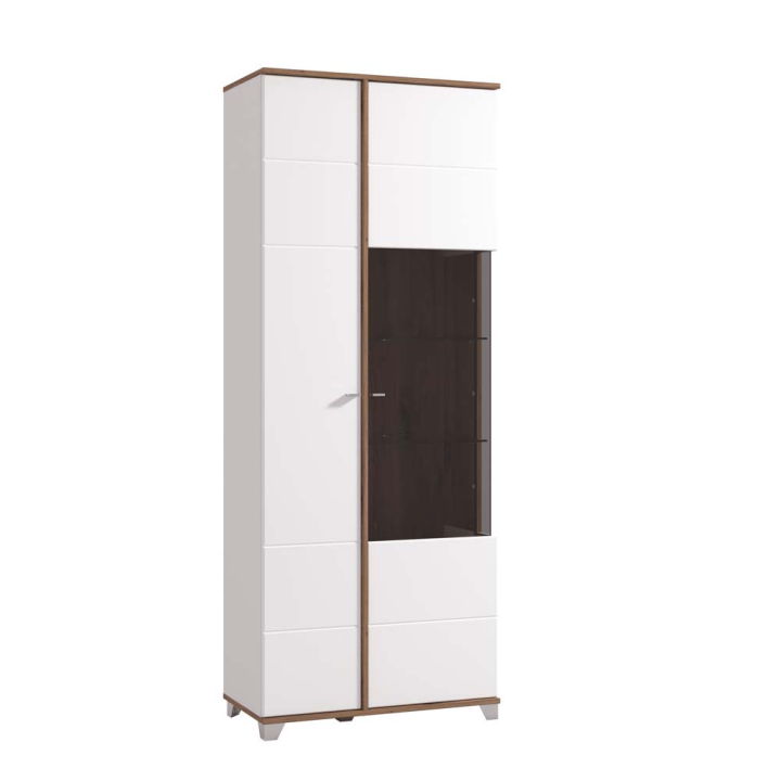 Висока витрина с размери Ш:78.5/Д:40/В:197 см. Моделът се състои от две самостоятелни отделения, достъпни посредством две врати на панти с мех. за плавно затваряне. Дясната врата е със стъклена витрина, зад която са монтирани два стъклени рафта. Шкафът е с вътрешна дървесна декорация, като поставените артефакти, снимки и други ценни предмети, ще са представени още по-красиво и стилно. Артикулът е част от цялостна система за обзавеждане на дневна, като комбиниран с останалите мебели от серията, ще създадете перфектната дневна в единен дизайнерски стил и визия.