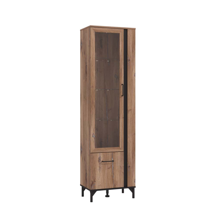 Висока витрина с размери Ш:54.5/Д:36/В:193 см. Моделът се състои от две самостоятелни отделения, в които са монтирани четири рафта, три от които произведени от стъкло обособяващи удобно място за съхранението и представянето на любими предмети или ценни вещи. Притежава светла дървесна декорация, с ясно откроени чворове и дървесни пукнатини. Витрината е стилно и практично обзавеждане за всеки дом, като ви препоръчваме да я комбинирате с останалите мебели от серията, за да създадете практично и стилно обзавеждане за дневна.