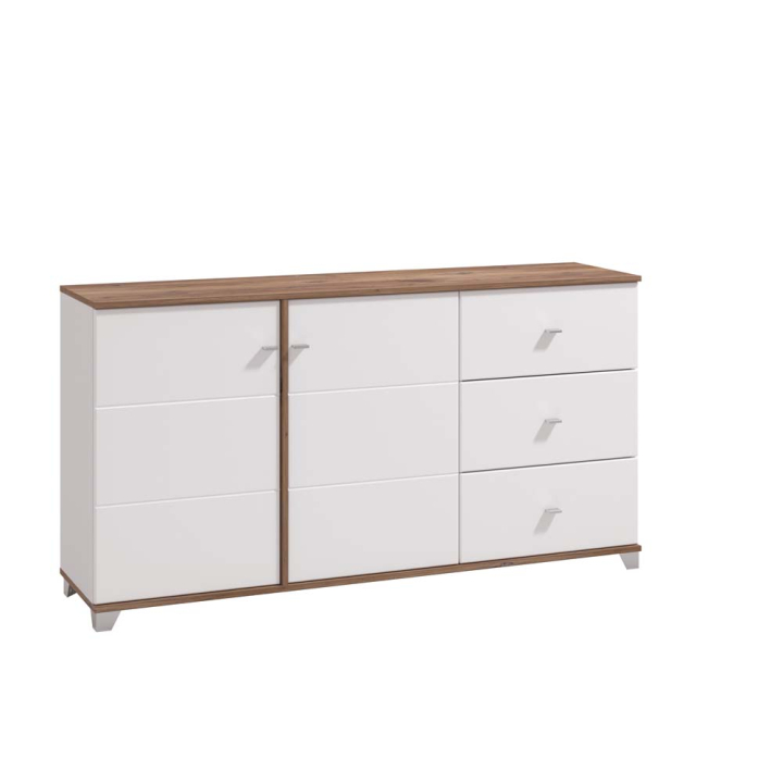 Модерен комод с размери Ш:162/Д:40/В:85 см. Моделът притежава две самостоятелни отделения с врати на панти, както и три еднотипни чекмеджета. Вратите са с мех. за плавно затваряне, което удобство със сигурност ще ви допадне. Зад вратите са монтирани два рафта, които обособяват четири практични ниши. Продуктът е стилно декориран в два цвята, като белият цвят е доминиращ. Светлата дървесна текстура на плота функционално допълва дизайна и допринася за уютната атмосфера в помещението. Артикулът е част от цялостна система за обзавеждане на дневна, като комбиниран с останалите мебели от серията, ще създадете перфектната дневна в единен дизайнерски стил и визия.