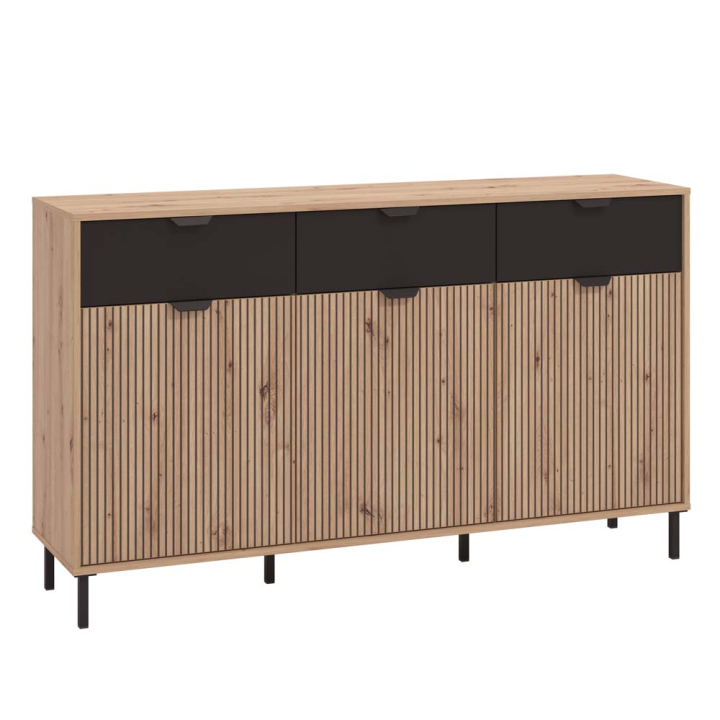 Комод с чекмеджета с размери Ш:157/Д:40/В:92.5 см. Разполага с обширен плот, под който са монтирани 3 чекмеджета с черни фронтове и 3 отделение с врати на панти. Вратите са на стилни ивици в красива дървесна текстура, зад които са поставени 3 рафта образуващи 6 ниши. Дъбовата репродукция е повече от подходяща за обзавеждане на дневна. Светлите шарки с тъмни чворове правят с лекота помещението по-красиво и уютно. С модела лесно ще обособите тематично кътче, като плотът е особено подходящ за поставянето на ваза с цвете или домашна декорация. В дизайна на комода силно впечатление ще ви направят вратите в дървесна текстура с вертикални ивици, чекмеджетата с черни фронтове, както и високите крачета, които предоставят възможност за лесно почистване.