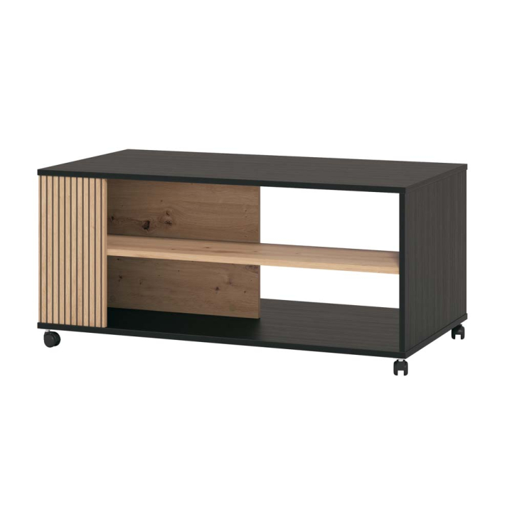 Стилна маса за вашето холно помещение съчетаваща във визията си черен и светъл дървесен цвят с линейни елементи.
