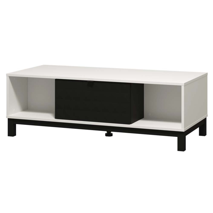 Централно позиционираният черен шкаф е изработен със специален механизъм за плавно затваряне, което предизвиква удобство и същевременно предпазва здравината и качеството на използваните материали - ПДЧ & МДФ. Вътрешната страна на шкафа сързва двете основи и съдава тунел към срещуположната част. Огледално позиционираните отворени ниши са позиционирани от двете страни на шкафа.