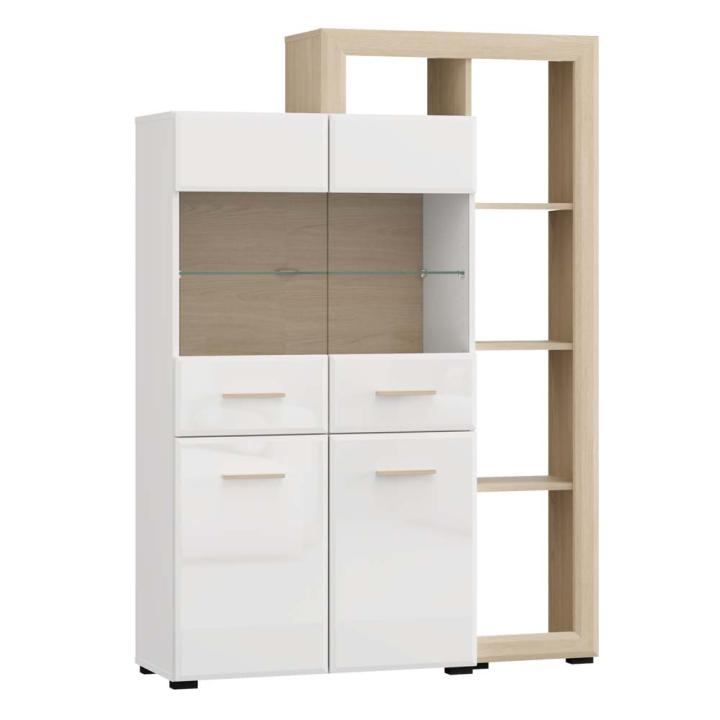 Витрина Карло с 4 врати в декор бял гланц и светъл дъб, размери: 112,5/35/157 см
