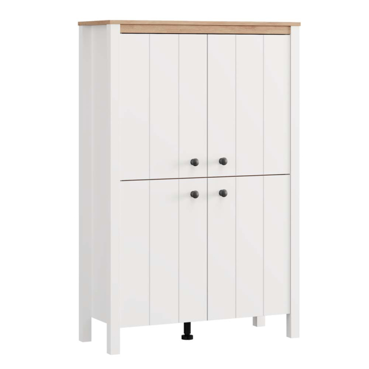 Високият шкаф Бедфорд предлага балансирано съчетание между функционалност и стил. Матово бялата визия създава усещане за простор и чистота, а дъбовият декор добавя уютен и натурален акцент. Със своя симетричен силует и ретро детайли, той се вписва хармонично както в класически, така и в модерни интериори.