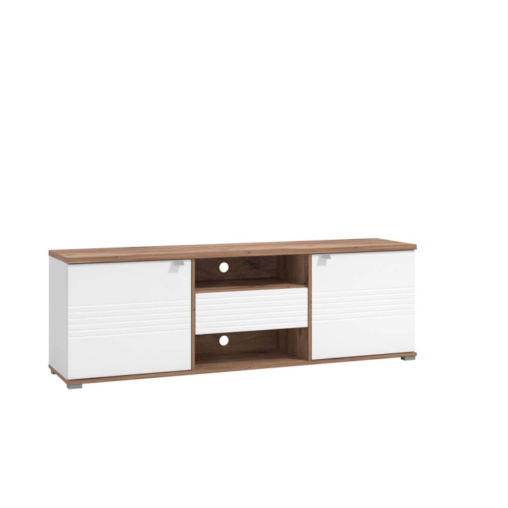Модерен ТВ шкаф с размери Ш:176/Д:40/В:57.5 см. Моделът е с големи размери, като на плота с дървесен декор повечето телевизори ще намерят своето безопасно и практично място. Разполага с две отделения с врати на панти, зад които са монтирани два вътрешни рафта за функционалното организация на всекидневната. Чекмеджето в средата е удобен помощник за съхранението на дискове, малки предмети, батерии за дистанционното и др. Шкафът разполага и с две отворени отделения с практични отвори за кабели за захранване на декодера и друга апаратура, които са с красива дървесна репродукция.
