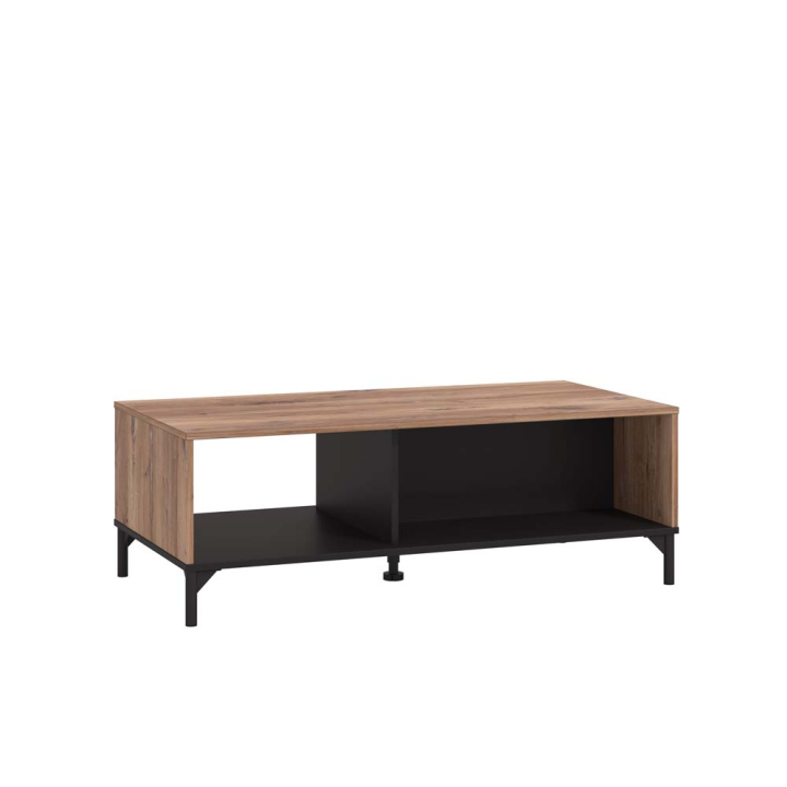 Холна маса с размери Ш:120.5/Д:60.5/В:42 см. Моделът разполага с плот в дъбов декор, под които са обособени три отворени ниши, две от които с гръб. В пространството под плота има много място за съхранението на малки домашни предмети, каталози и списания. Масата е с височина 42 см, колкото е приблизителната височина на повечето холни гарнитури, и с капацитет да настани удобно до 6 човека. Моделът е с красива светла дървесна декорация, с ясно откроени чворове и дървесни пукнатини. Холната маса е стилно и практично обзавеждане за всеки дом, като ви препоръчваме да я комбинирате с останалите мебели от серията, за да създадете практично и стилно обзавеждане за дневната.