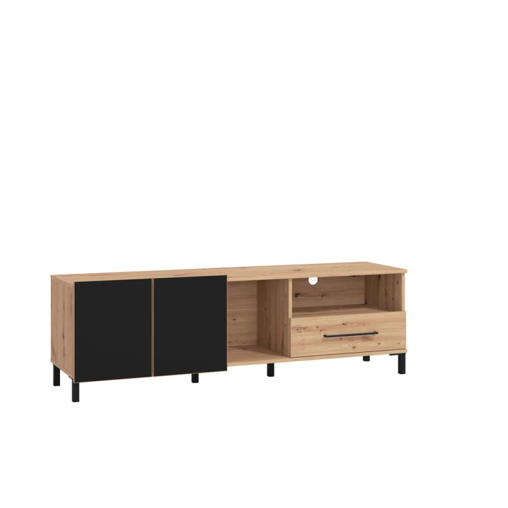 Модерен ТВ шкаф с две врати с размери Ш:160/Д:41.5/В:49 см. Моделът се състои от едно чекмедже, отделение с врати на панти, както и две отворени ниши, едната от които с отвор за кабели. Шкафът е цялостно декориран в дървесна текстура (дъб Артисан), като единствено двете врати и крачетата са в черен цвят. Зад вратите може да съхранявате всякакви домашни предмети, като книги, ел. апаратура, лични вещи и аксесоари, а в чекмеджето да подредите личните ви DVD колекции, настолни игри и други домашни предмети. В нишата под плота с отвор за кабели може да държите ТВ декодера и телевизионна техника, а в нишата до нея списания или каталози, които ще са винаги лесно достъпни за бърз преглед. Вратите без дръжки напълно отговарят на съвременните и модерни тенденции при производството на мебели. Продуктът отлично би се вписали в интериора на повечето дневни.