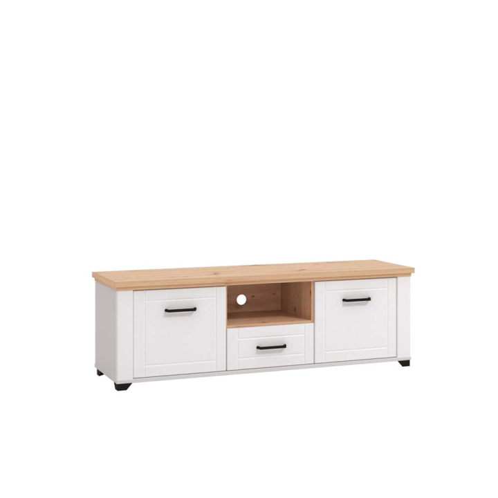 Красив ТВ шкаф с размери Ш:147/Д:41/В:47.5 см. Моделът е здраво стъпил на пода, посредством черни крачета, осигуряващи нужната стабилност на телевизора. Шкафът разполага с плот с големина 147/41 см, в светъл дървесен декор, ниша с отвор за кабели, едно чекмедже, както и две обширни еднотипни отделения с врати на панти. Освен за поставянето на телевизора върху плота и съхранението на нужната апаратура, шкафът може да бъде използван и за подреждането на малки домашни предмети в него. Обмислете внимателно къде ще го поставите в помещението, като най-удачното място е в страни от прозорци на централно видимо място от всички. Изберете най-доброто местоположението в зависимост от светлинните условия в стаята.