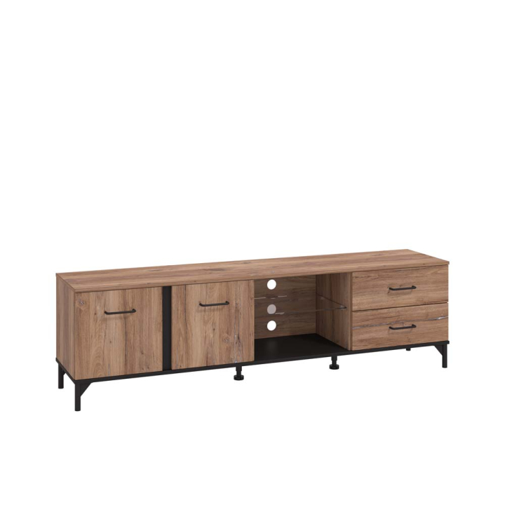 Модерен ТВ шкаф с размери Ш:190/Д:42/В:53.5 см. Продуктът се състои от стабилен плот, където повечето телевизори ще намерят своето практично и сигурно място, едно отделение с две врати на панти, две чекмеджета, както и отворена ниша с монтиран в нея стъклен рафт. Освен за поставянето на телевизора, шкафа предоставя и практично място за съхранение на ел. апаратура, дискове, лични вещи и аксесоари в отделенията под плота. Моделът е с красива светла дървесна декорация, с ясно откроени чворове и дървесни пукнатини. ТВ шкафа е стилно и практично обзавеждане за всеки дом, като ви препоръчваме да го комбинирате с останалите мебели от серията, за да създадете практично и стилно обзавеждане за дневната.