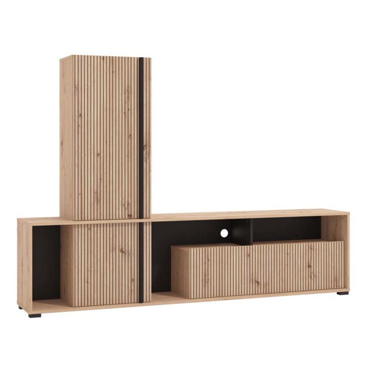 Шкаф за телевизор в съчетание на светъл-дървесен и черен цвят, 195.5/33/139.5 см с разпределение от две основни части.