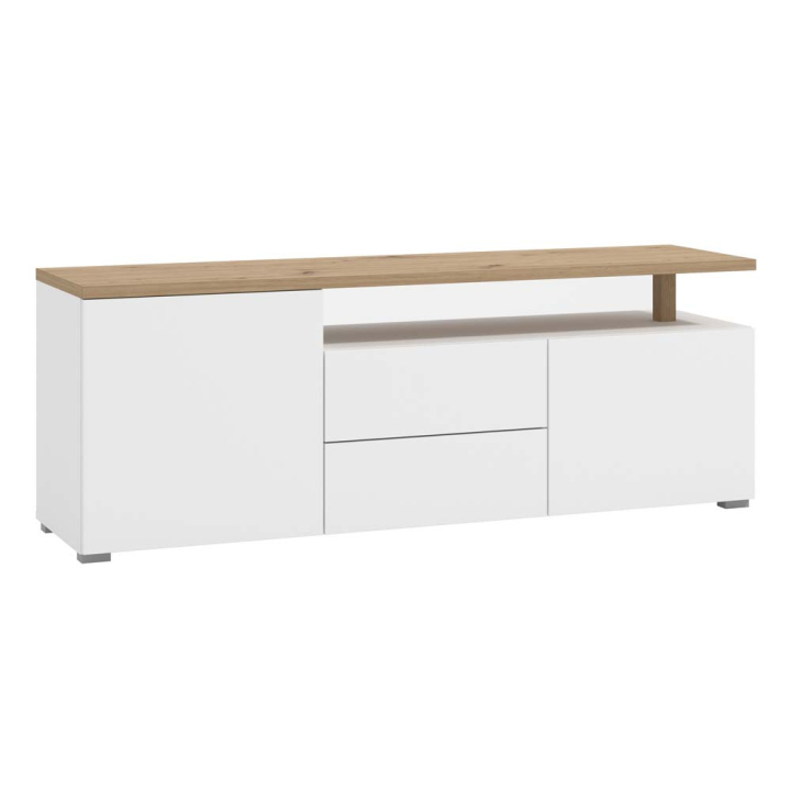 ТВ шкаф Атерно с 2 врати и две чекмеджета в декор дъб артисан и бял мат, размери: 154/40/56 см