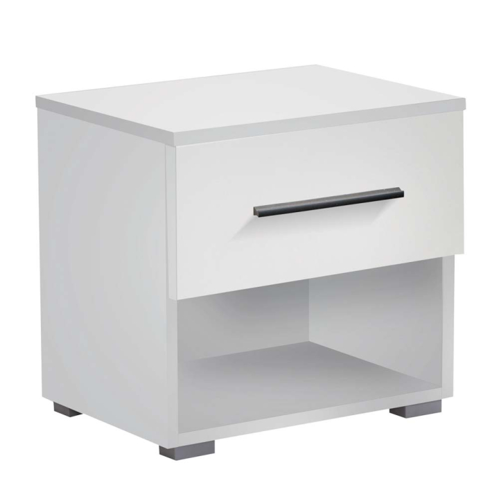 Нощно шкафче с чекмедже с размери Ш:44.5/Д:33.5/В:42.5 см. Задължително допълнение към спалнята. Удобно местенце да поставите телефона или чашата с вода, само на ръка разстояние от леглото. Притежава здрава конструкция с компактен плот, 1 чекмедже с черна дръжка, както и 1 отворена ниша. Моделът е с покритие устойчиво на влага и механично износване.