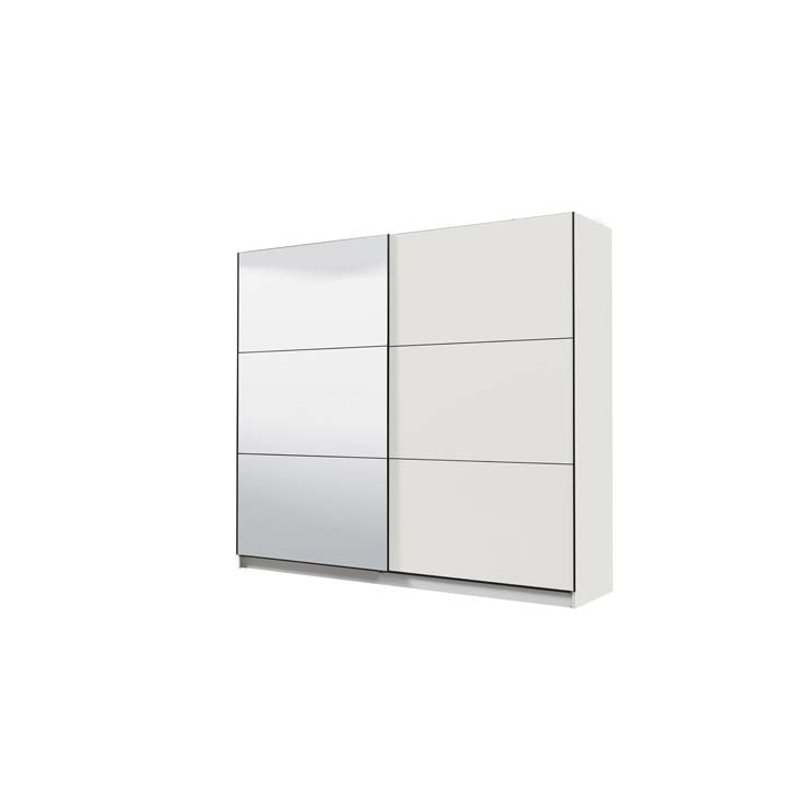 Двукрилен гардероб с плъзгащи врати с размери Ш:217/Д:62.5/В:210 см. Артикулът е цялостно декориран в бял цвят, като на лявата врата са монтирани 3 огледала, в които може да се огледате в цял ръст. Вътрешното разпределение е повече от практично. Разполага с 2 самостоятелни еднотипни отделения, като във всяко са монтирани по 4 рафта и 1 лост за закачалки. Моделиран по този начин, подреждането на дрехите с различно предназначение и стил в гардероба е приятна детска игра. Артикулът е произведен от ПДЧ с меламиново покритие в устойчиво на влага и механично нараняване. Под лоста за закачалки може практично да съхранявате домашни предмети и лични вещи. Със своите две функционални отделения артикулът е чудесен избор за обзавеждане на спалня на двойка споделяща общо пространство, ценящи личното си пространство. Възможно е добавянето на механизъм за плавно затваряне (77254060050).