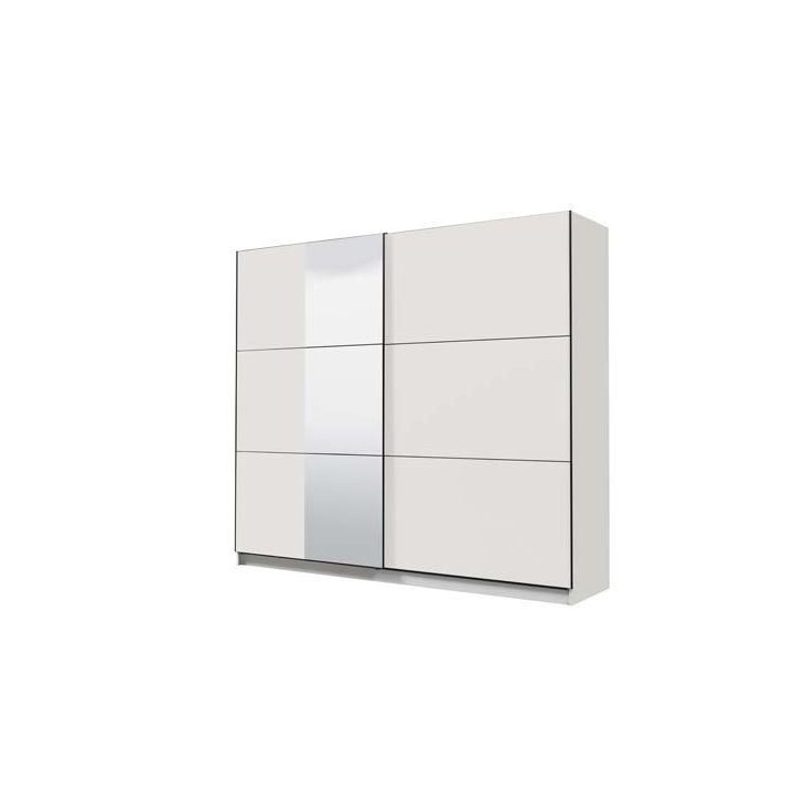 Модерен двукрилен гардероб с плъзгащи врати с размери Ш:236.6/Д:62.5/В:210 см. Артикулът е цялостно декориран в бял цвят, като към лявата врата са монтирани три огледала, в които може да се огледате в цял ръст. Вътрешното разпределение е повече от практично. Разполага с две самостоятелни отделения с монтирани във всяко по един лост за закачалки, три малки рафта и един голям горен рафт. Под лостовете за закачалки има достатъчно място за поставянето на кутии за обувки, кутии за предмети или куфари. Със своето вътрешно разпределение подреждането на дрехите с различно предназначение и стил в гардероба е приятна детска игра. Модерен и изключително функционален гардероб, изработен от ПДЧ с меламиново покритие в устойчиво на влага и механично нараняване. Към вратите е възможно добавянето на механизъм за плавно затваряне (77254060050). Със своите две функционални отделения артикулът е чудесен избор за обзавеждане на спалня на двойка, която цени личното пространство на партньора.